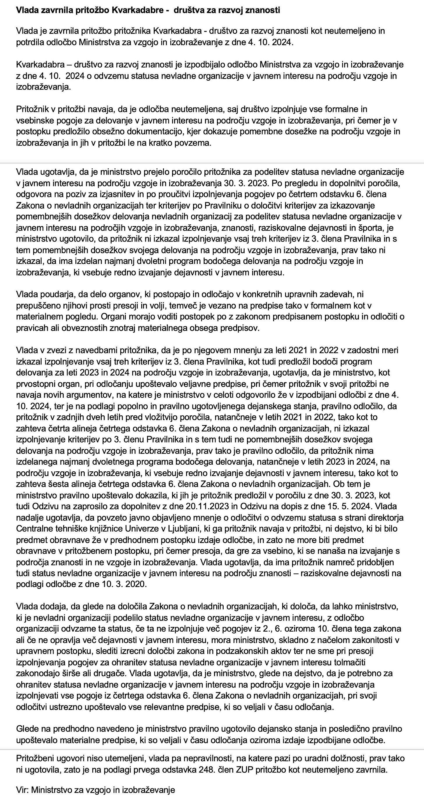 Ne gojim iluzij, da so ministrice in ministri dejansko podrobno preučili, o čem so 9. januarja 2025 sploh odločali. Težko si predstavljam, kako bi kdorkoli z vsaj osnovno mero razuma in objektivne presoje po pregledu spletne strani Kvarkadabra, podkastov, knjig in drugih objav lahko sklenil, da te vsebine niso v javnem interesu na področju izobraževanja.