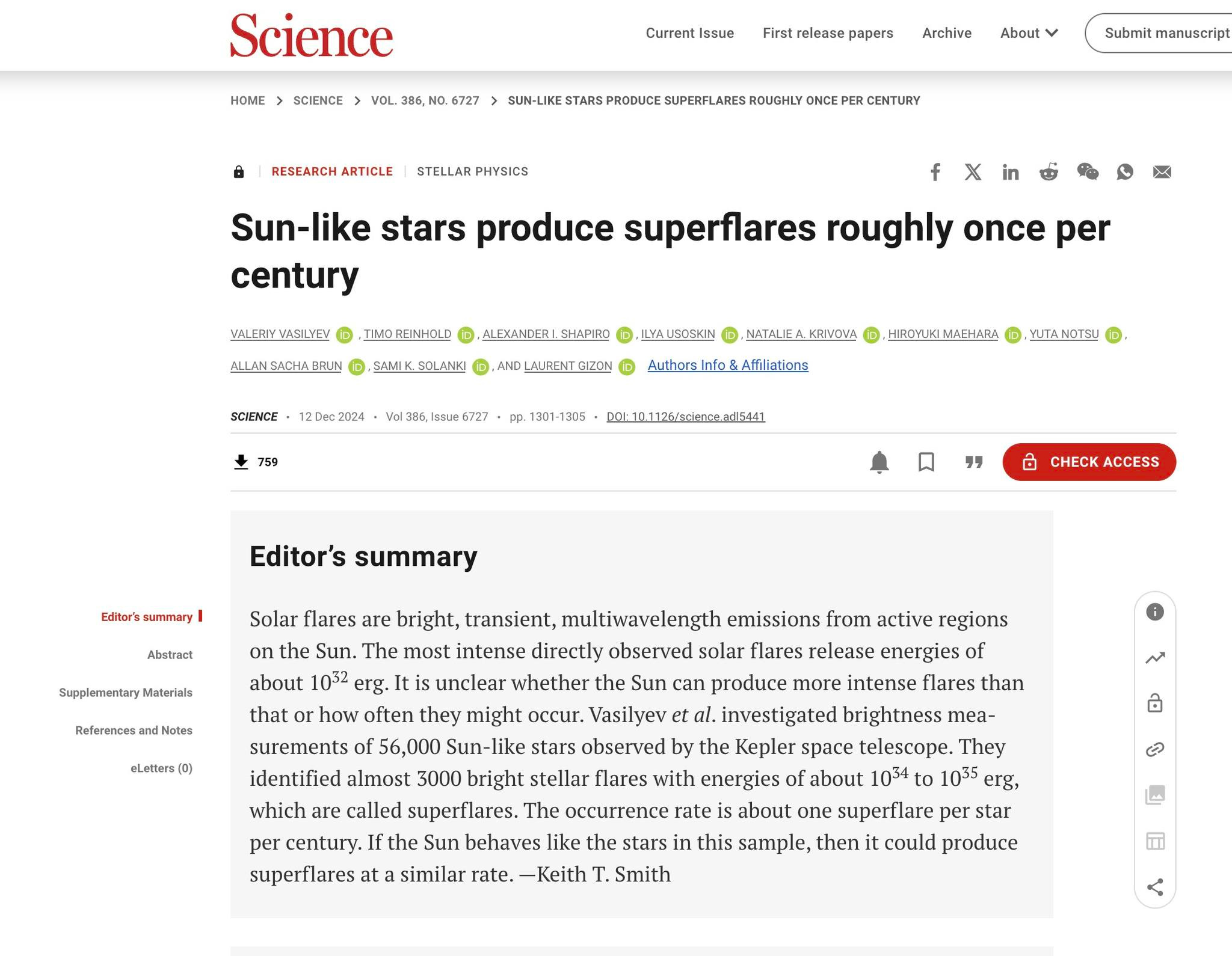 Valeriy Vasilyev et al., Sun-like stars produce superflares roughly once per century. Science 386, 1301-1305 (2024) . DOI:10.1126/science.adl5441